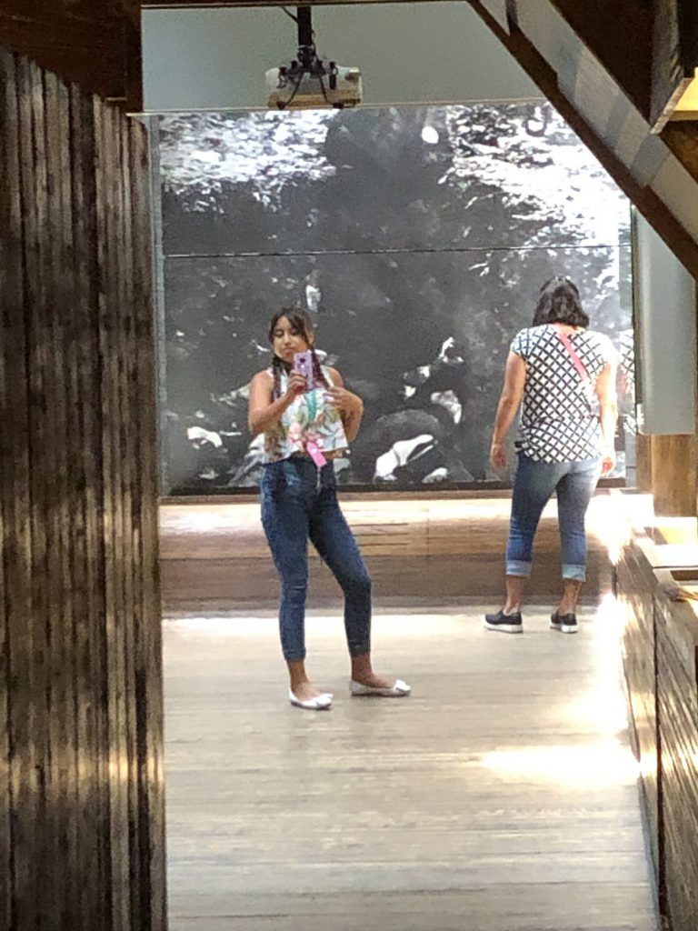 Ze bezoekt, net als wij, het Museo Memoria y Tolerancia. Vijftien, zestien jaar oud schat ik haar. Ze controleert via de selfie camera of alles goed zit. Haar make-up, haar kapsel, alles wordt gecheckt. Ze geeft haar mobiel aan haar moeder.