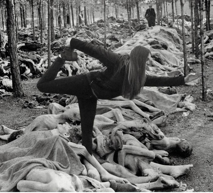 Ze poseert lachend voor een achterwand waarop een uitvergrote foto staat afgebeeld met daarop zichtbaar de lijken in het concentratiekamp die richting verbrandingsovens worden getransporteerd. Een luguber beeld. Maar van het tafereel dat zich ervoor afspeelt gruwel ik nog meer.