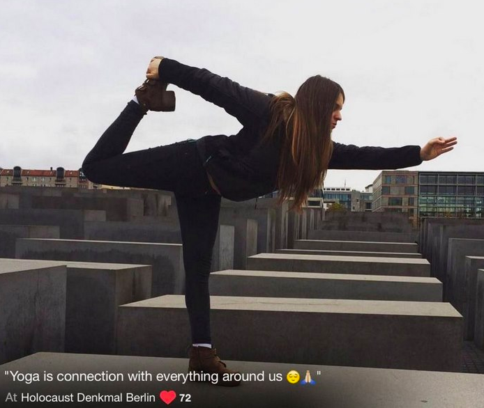 De generatie die met googlen is grootgebracht, zeg maar de generatie van het meisje in het museum, is zich van geen kwaad bewust. Zij mist de context van de holocaust. Zij is in een museum. Met haar moeder. Met foto’s. Met voorwerpen. Met een rondleiding. Met verschillende ruimten. Iemand die op de betonnen grafzwerken in Berlijn haar yoga oefening doet ziet het Holocaust Mahnmal als onderlegger, als mooi plat vlak. Daar zit geen rottigheid bij.